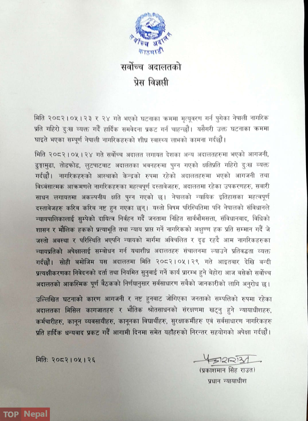 ‘जेन–जी’ को आन्दोलनका कारण सर्वाेच्च अदालत, सिंहदरबारसहित काठमाण्डौका प्रमुख प्रशासकीय भवनहरूमा प्रदर्शनकारीहरूले आगजनी गरेका थिए ।