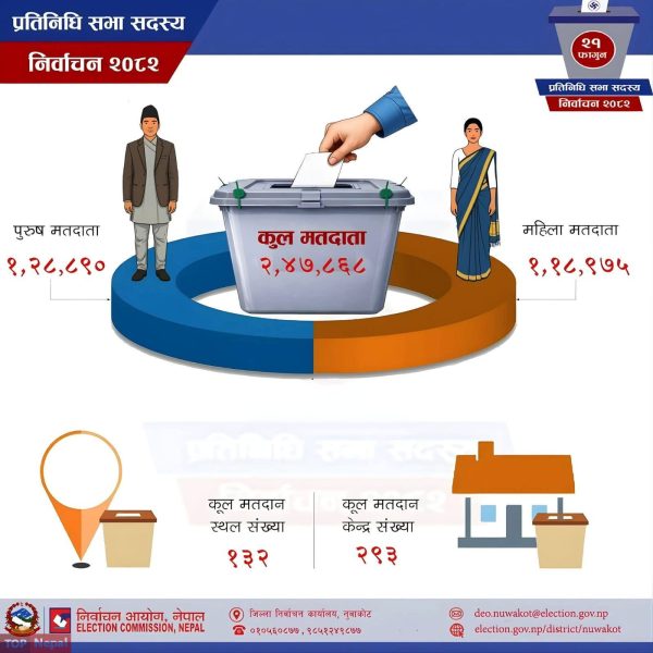 उहाँको अनुसार नुवाकोटका तीस जना उम्मेदवार मध्ये क्षेत्र नं १ का स्वतन्त्र उम्मेदवार चेपे तामाङ मात्र महिला उम्मेदवार हुनुहुन्छ । क्षेत्र नं १ मा मनोनयन दिएका अठार जना उम्मेदवार मध्ये पञ्चकन्या गाउँपालिकाबाट मात्रै छ जना उम्मेदवार चुनावी प्रतिस्पर्धामा रहेका छन् ।