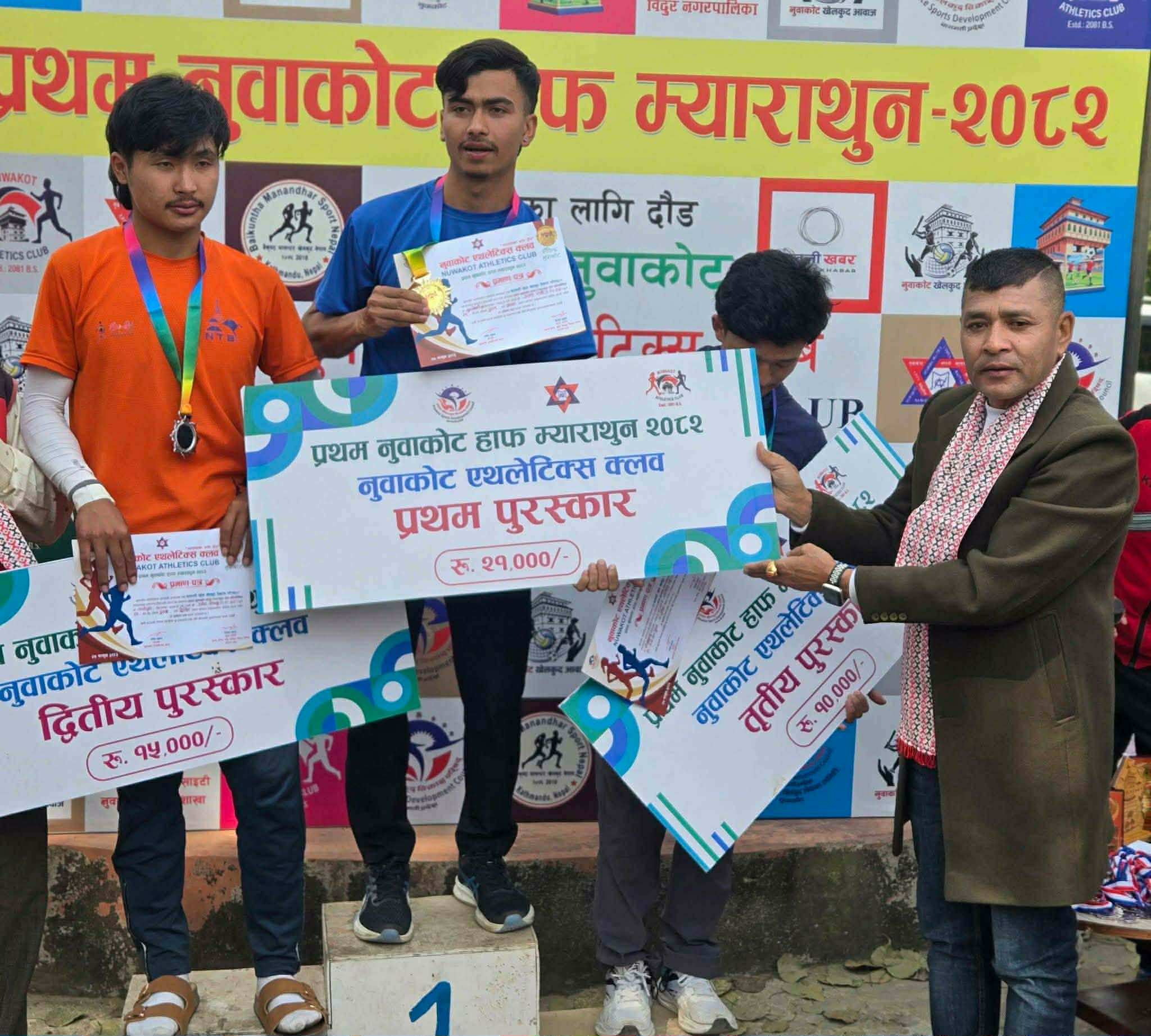 नुवाकोट । राष्ट्रिय प्रजातन्त्र दिवसको अवसरमा नुवाकोट एथलेटिक्स क्लबको आयोजना तथा बागमती प्रदेश खेलकुद बिकास परिषदसंगको सहकार्यमा आयोजित ‘प्रथम नुवाकोट हाफ म्याराथुन दौड प्रतियोगिता–२०८२’ बिहीबार सम्पन्न गरेको छ ।
